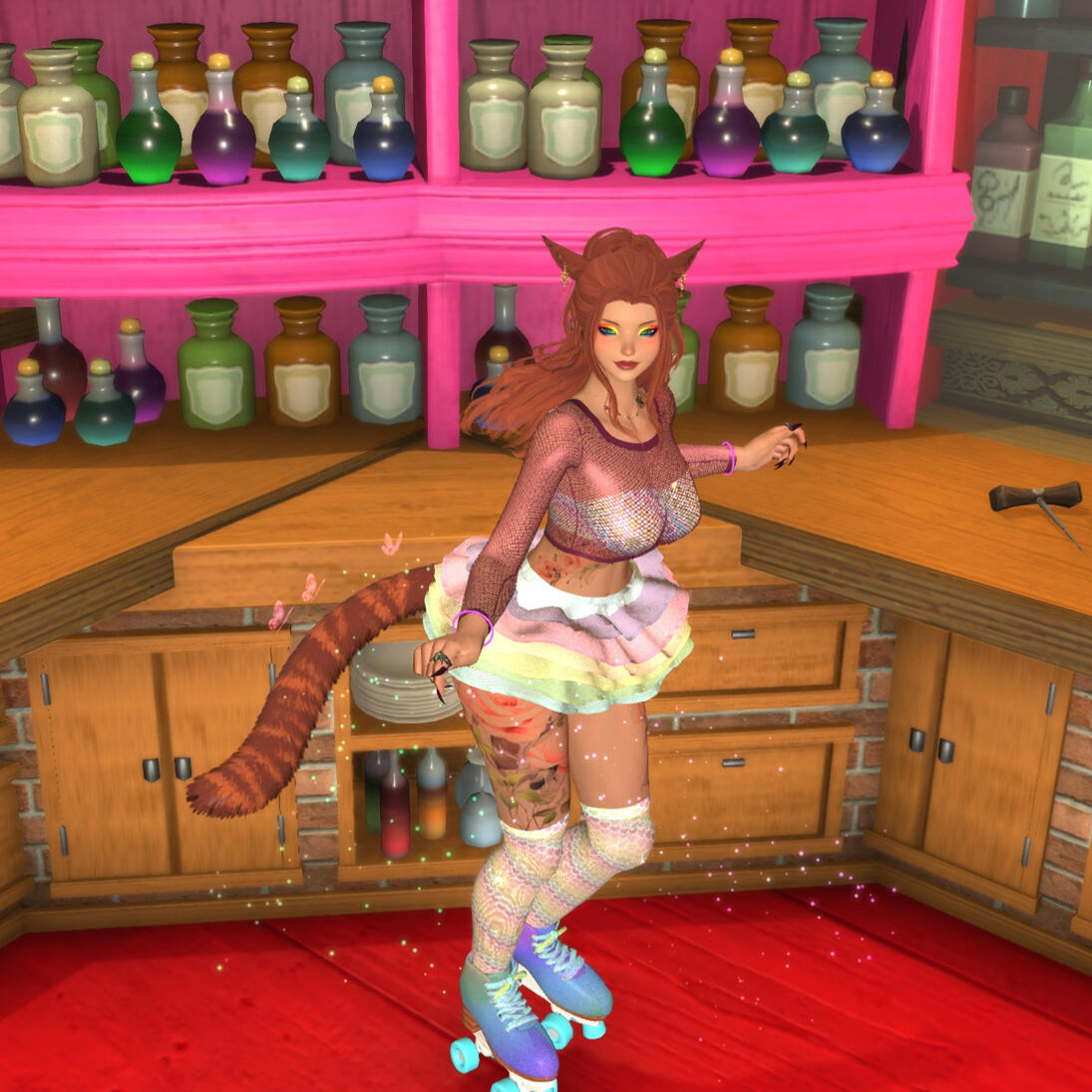 Zinami is the one behind the bar making your drinks and listening to your secrets on club nights. A social butterfly and a spirited dancer that will pick flowers off the wall and get you dancing, singing and having fun!She is also a bard, whom is known for hip-hop and whimsy. If you want to have a good time, Zin is your cat. Her speaking however, is a bit broken due to her tribal upbringing, huntspeak and sign language being her first language.She is always in bright, shiny colors with glitter butterflies on her tail! You can’t miss Zinami in a room.