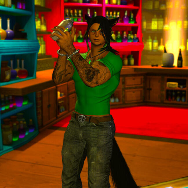 Davor grew up high in the mountains of Ilsabard. After the Empire came and recruited or killed his tribe, he fled with one other survivor. The other that escaped was his cousin. They went their seperate ways in Limsa after a long sea voyage from Kugane.Davor loves to dance and have fun. He can't read very well, and his common isn't the best, but he tries really hard to bring a smile to each and every guest and member of Rainbow Room. He loves his Greeter job, almost as much as dancing.